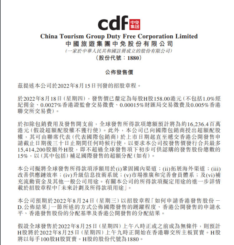 中国中免在港交所公告,香港IPO发行价已定为每H股158.00港元。预计H股将于8月25日(星期四)上午九时正开始在香港联交所主板买卖。