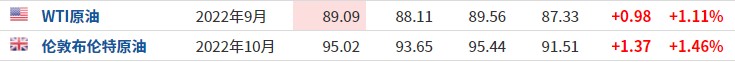 3. 截至发稿,WTI原油涨1.11%,报89.09美元/桶;布伦特原油涨1.46%,报95.02美元/桶。