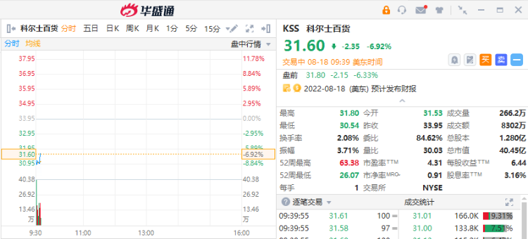 柯尔百货跌7%,二季度净利润同比减少63%至1.43亿美元,公司将全年调整后每股盈利指引大幅下调至2.8-3.2美元。