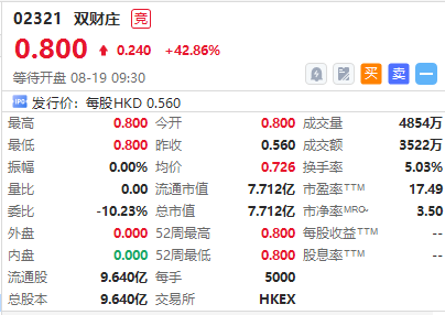 华盛资讯8月19日讯,马来西亚食品饮料分销商双财庄 $02321.HK 首挂高开42.86%,一手账面浮盈约1200港元,盘前成交额3522万港元,昨日暗盘收涨53.57%。