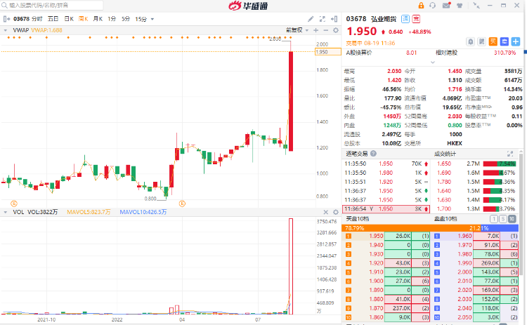 华盛资讯8月19日消息,弘业期货继续近期上升趋势,盘前高开10.69%,现涨48.85%,报1.95港元每股,成交额6147万港元。消息面上,弘业期货获调入港股通标证券名单,今日起生效。
