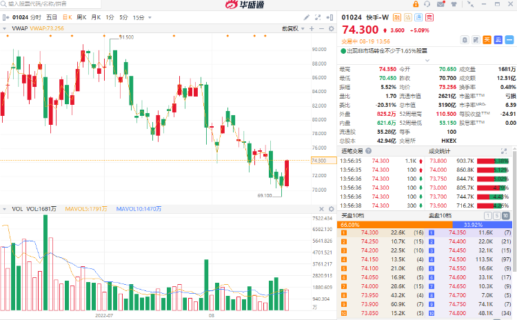 华盛资讯8月19日消息,快手-W午后持续走高。截至发稿,涨5.09%,报74.3港元每股,成交额12.31亿港元。