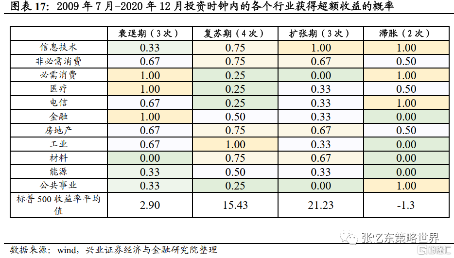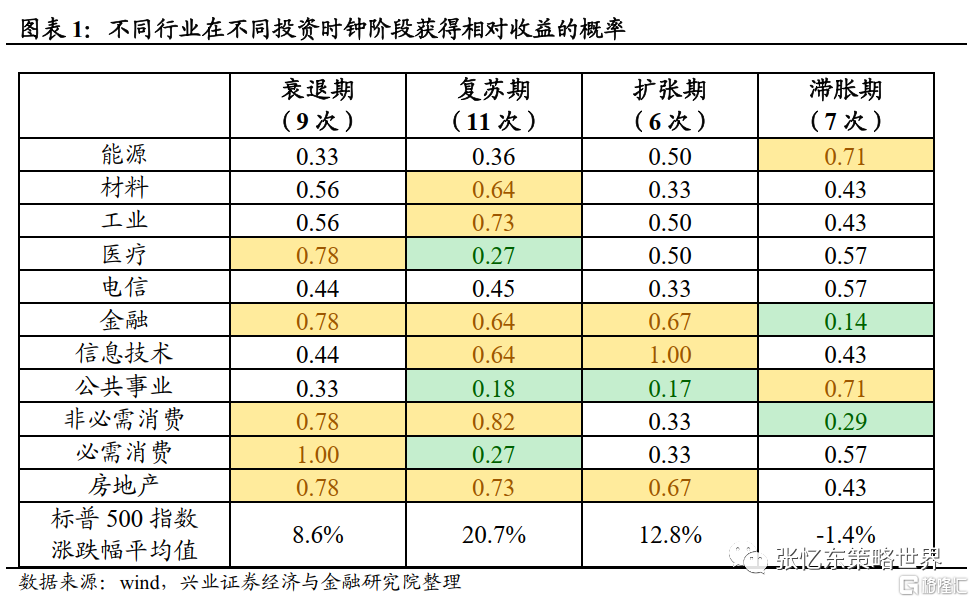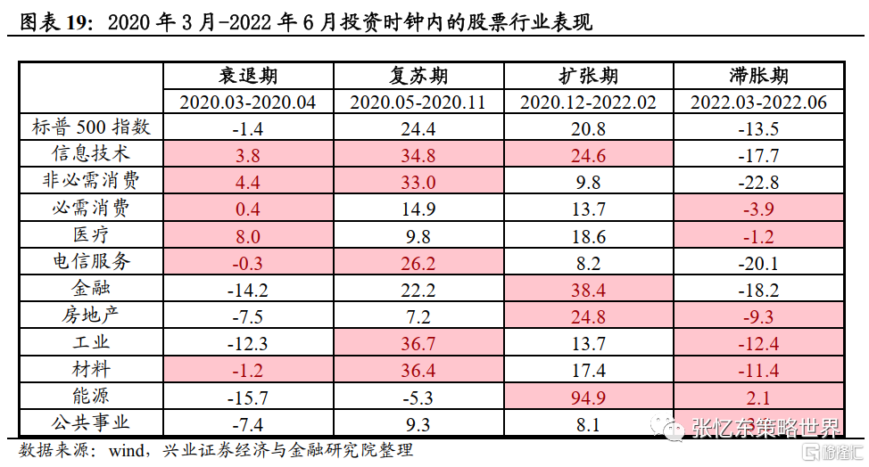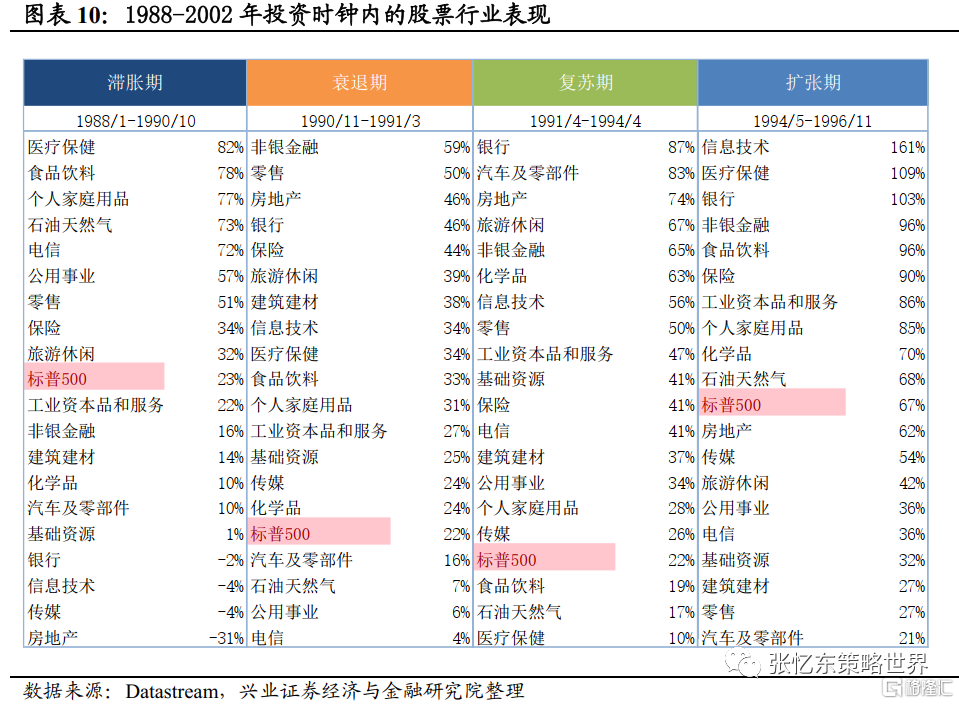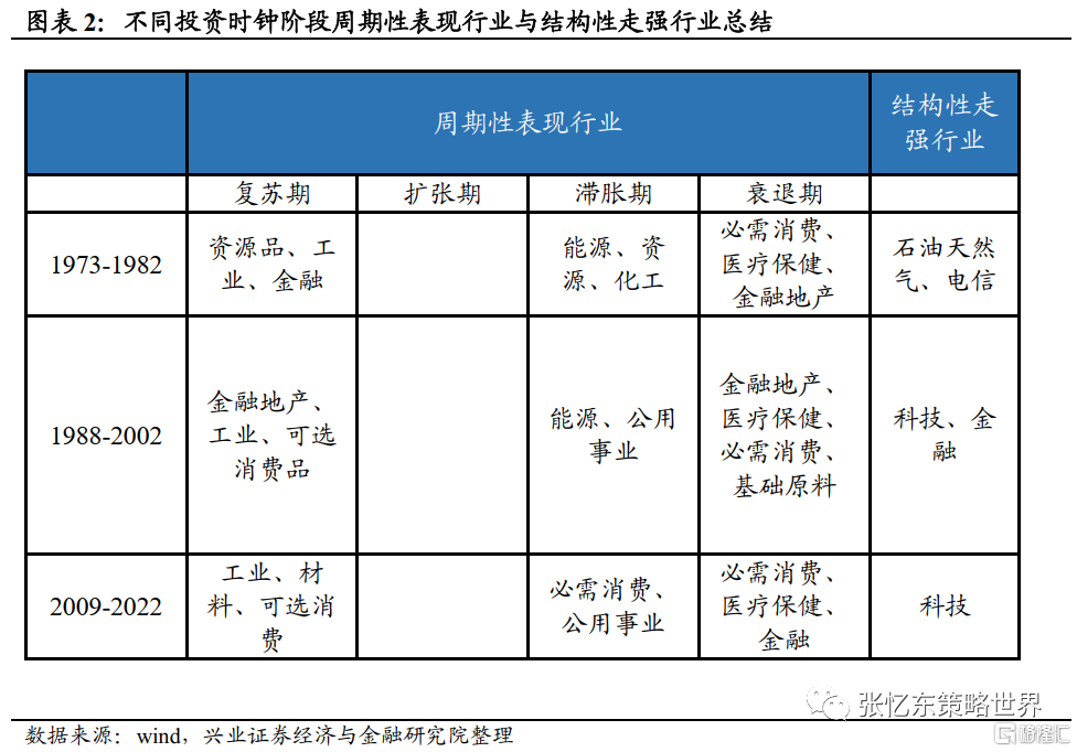通过对1973年以来美股投资时钟的分析,从获得超额收益的行业角度来看,我们发现在投资时钟的不同阶段,股票行业表现存在一定的规律: