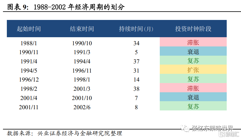 这一轮经济周期也是一轮经典的四阶段投资时钟。有所不同的是,1981年9月之后经济并没有进入扩张,而是进入了衰退期。这和当时沃克尔紧缩货币治理通胀有关。不过这并不影响投资时钟理论的运用。