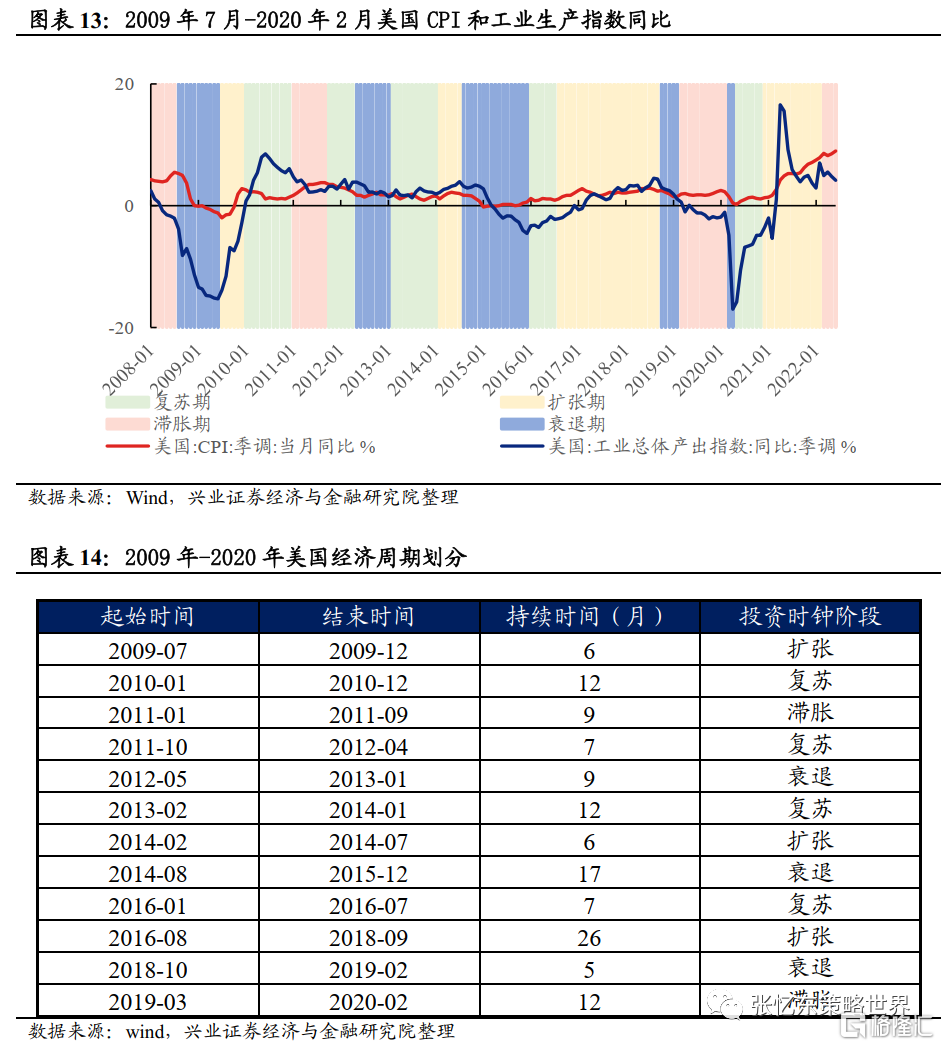 2009年7月至2020年2月,美国大致经历了两轮经济周期:(1)2009年7至2015年12月,此轮经济周期中每个阶段持续时间都较短,周期轮动顺序不稳定,同时周期切换很快,依次经历了扩张、复苏、滞胀、复苏、衰退、复苏、扩张、衰退。(2)2016年1月至2020年2月,货币政策正常化之后,美国经历了复苏、扩张、衰退、滞胀。在这两轮经济周期中,美国没有经历较明显的通货膨胀。