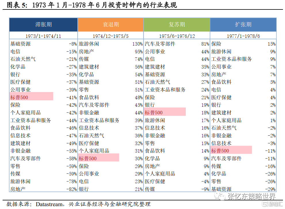 滞胀期:1973年1月-1974年11月。当时受供给短缺影响,粮食价格大幅上涨,叠加石油危机的持续发酵,CPI大幅攀升;石油价格的快速上升,使得汽车销量出现显著下滑,居民消费支出下降,私人部门生产投资活动也大幅放缓。这一阶段,股票市场中,有超额收益的板块为资源品(基础资源+石油天然气+化学品)和公用事业类(电信+医疗保健+公用事业)。有负超额收益的可选消费属性行业(地产、旅游、传媒、汽车、零售等)。