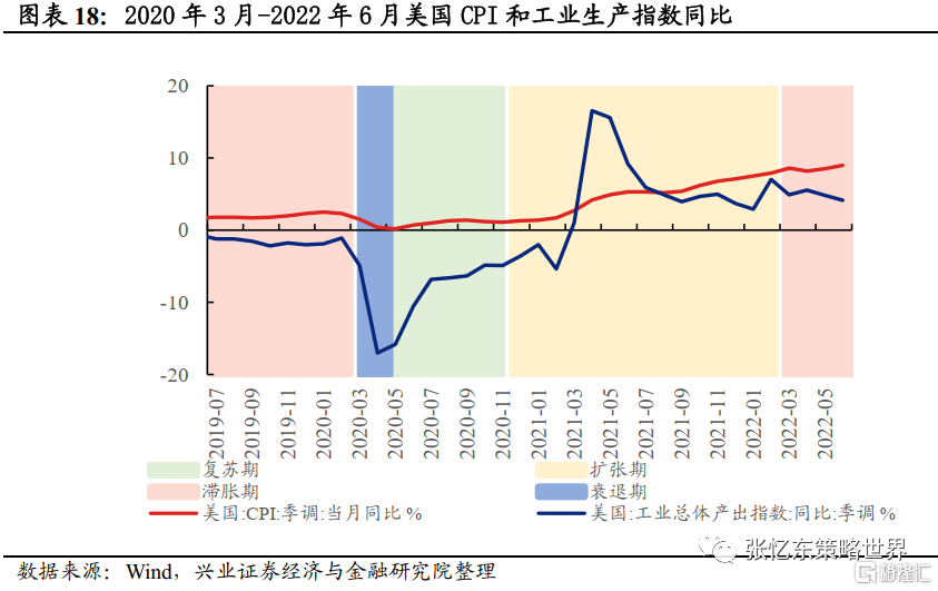 2020年3月至2022年6月,美国经历了一轮经典的经济周期,依次经历了衰退(2个月)、复苏(7个月)、扩张(15个月)、滞胀(4个月)。(括号内为持续时间)