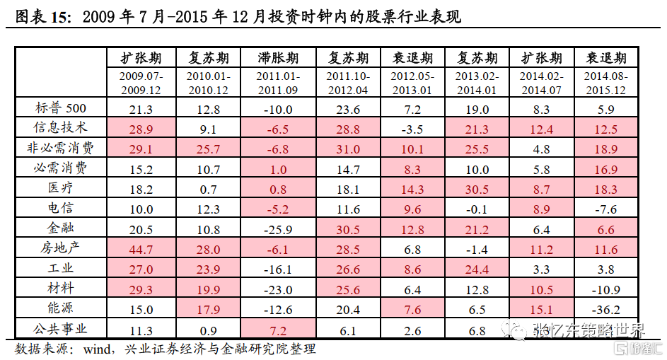 扩张期:能源、信息技术、金融、房地产大幅跑赢市场。非必需消费、电信、公共事业表现较弱。