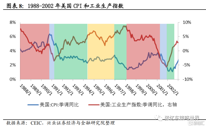 1988年1月至2002年6月,美国经历了完整的两轮经济周期,也是历史上最为长期的一轮景气周期,共持续174个月:(1)1988年1月至1996年11月,依次经历了滞胀、衰退、复苏、扩张。(2)1996年12月至2002年6月,经历了复苏、滞胀、衰退、复苏。在这两轮经济周期中,美国没有经历较明显的通货膨胀。