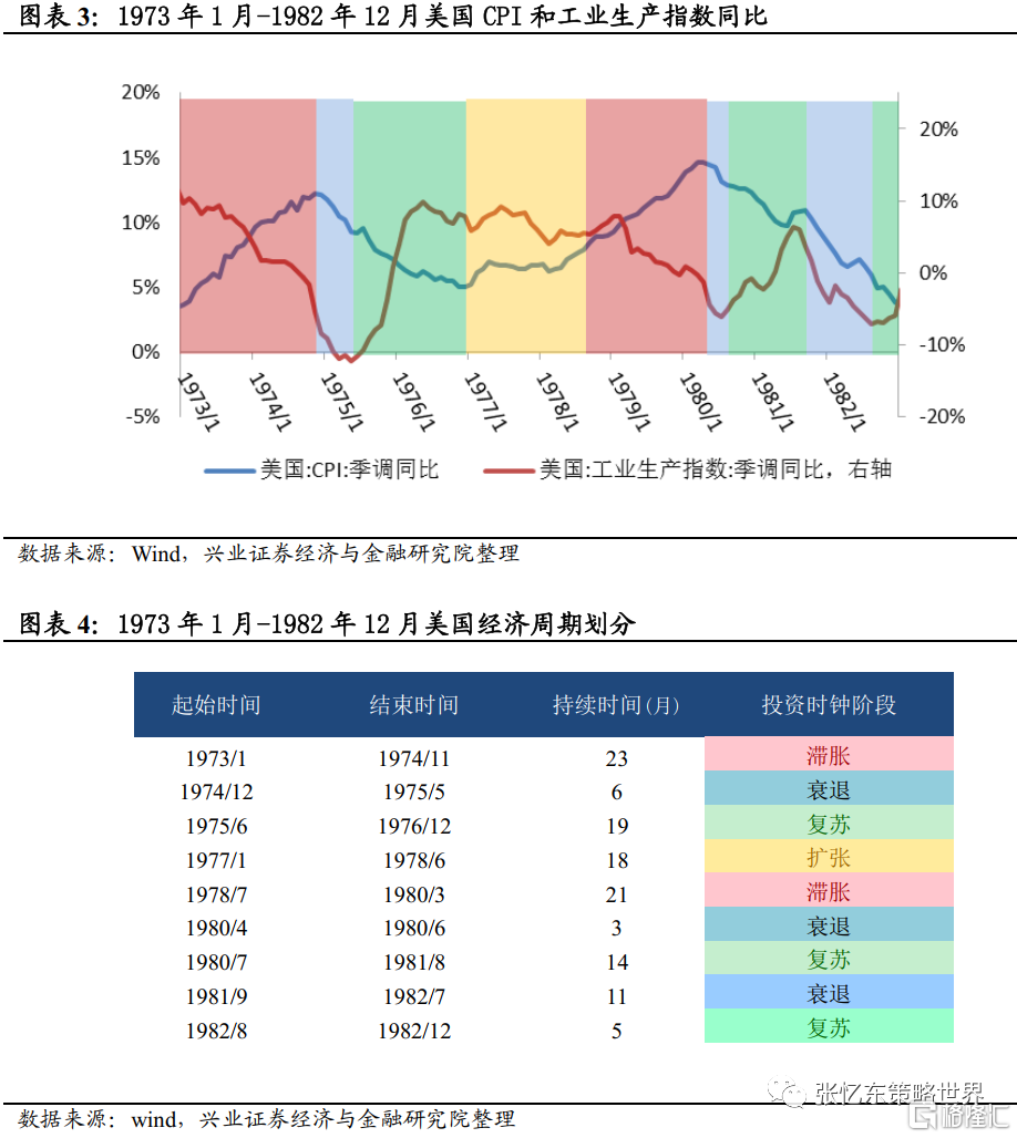 我们将1973年定为研究起点。从1973-1982年间,经济经历了两轮完整的周期:(1)从1973年1月到1978年6月,经历了滞胀、衰退、复苏、扩张。(2)从1978年7月-1982年8月,经历了滞胀、衰退、复苏、衰退。这种经典的行业轮动阶段非常适合拿来作为研究剖析。