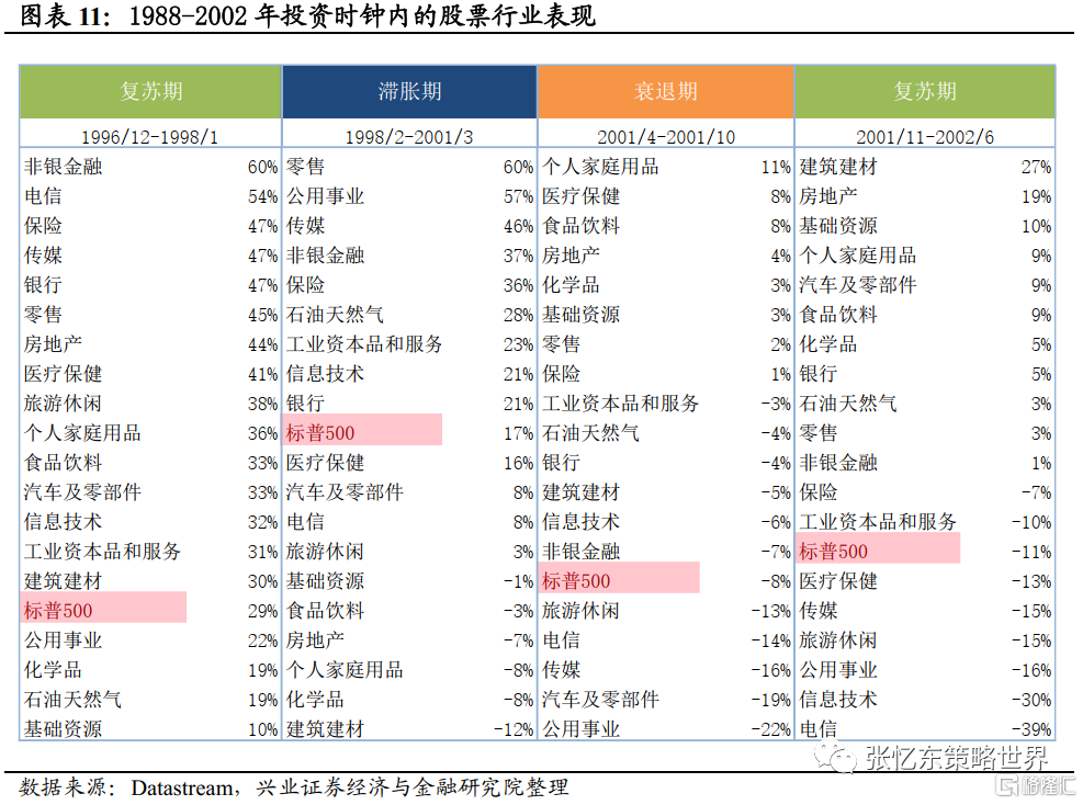 滞胀期:1998年2月至2001年3月。美国股市随经济持续上涨100多个月,泡沫终于有所察觉,标普500指数开始“技术回调”,科技股泡沫破灭,克林顿繁荣终结。行业表现无鲜明分布特征,获得超额收益的行业有零售、公用事业、传媒、非银金融、保险、石油天然气、工业资本品和服务等。电信股的疯狂上涨告一段落。建筑建材、化学品、必需消费、房地产、基础资源绝对收益为负。