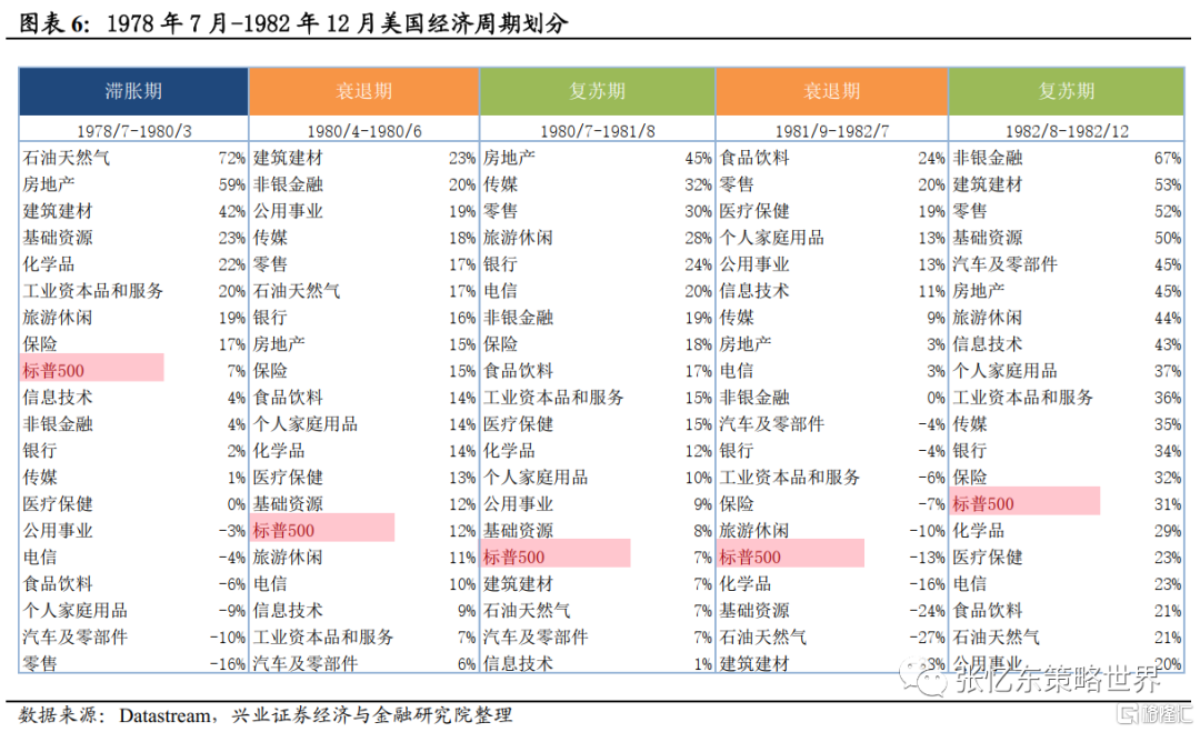 扩张期:1977年1月-1978年6月。经历了1975-1976年通胀的下降,1977年通胀再度上行,货币政策再次偏向紧缩,标普500指数在这一扩张期内是负收益,主要是被基础资源、零售、化学品等行业拖累。相对正收益的行业有保险、旅游休闲、工业品,行业特征不是非常明显。