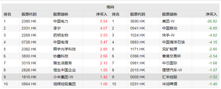 个股资金流向统计:南下资金加仓中国电力、李宁、药明生物;沽出美团-W、中国移动、快手-W