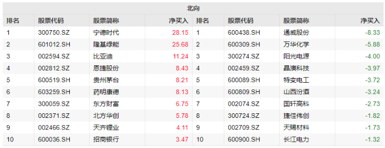 本周北上资金买入金额最多的标的为宁德时代,一周净买入28.15亿元,隆基绿能获净买入25.68亿元,比亚迪获净买入11.24亿元;此外,恩捷股份、贵州茅台、药明康德等获得买入。