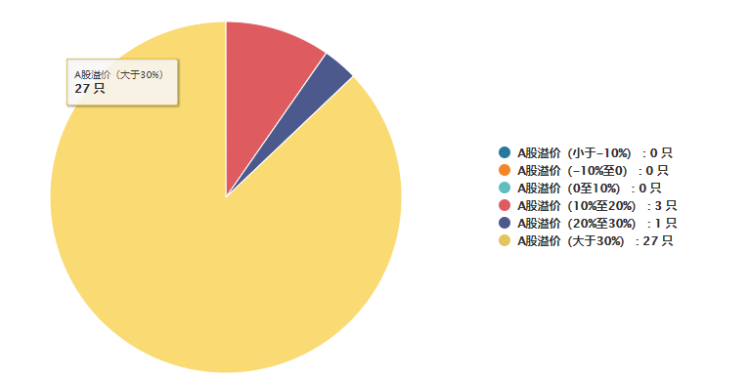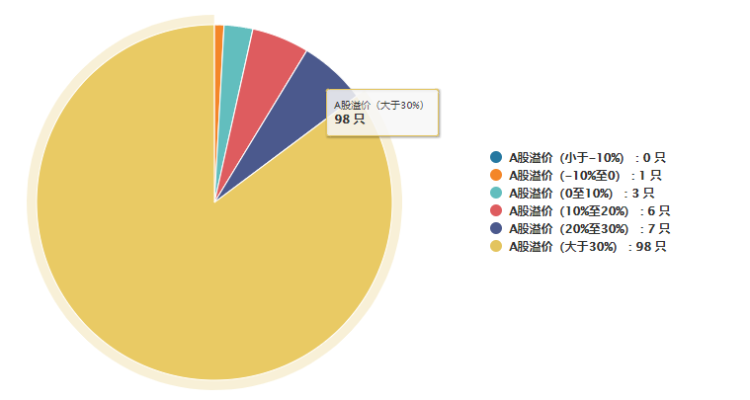 本周有125只A股溢价超过30%,8溢价在20%至30%之间,9只在溢价10%至20%之间,3只溢价在0-10%之间,1只溢价在-10--0%之间。