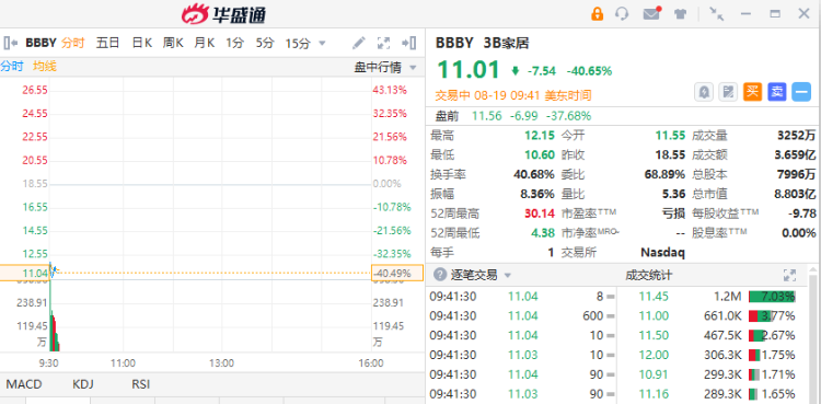 华盛资讯8月19日消息,美股盘初,WSB概念股集体下挫,截至发稿,3B家居大跌40%,报11.01美元,成交额3.659亿美元。此前,公司最大股东之一瑞安科恩出售了所持该公司全部股份,而更糟糕的情况可能还在后面:华尔街投行已经纷纷对该股给出了超低目标价。