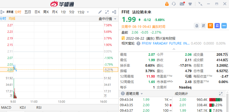 新能源汽车板块普跌,截至发稿,法拉第未来跌超5%,报1.99美元。