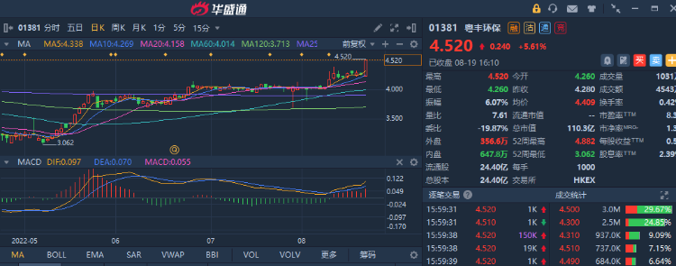 由国务院印发的《2030年前碳达逢行动方案》,要求加快实现生产生活的绿色变革,并推动经济及社会发展,要建立在资源高效利用和绿色低碳发展的基础上。要大力推进生活垃圾减量及资源化。更明确要求提高生活垃圾焚烧处理比例。希望到2025年底,全国城镇日处理生活垃圾能力可达到每日80万吨,占比要高至65%。可于现价4.52元附近吸纳,中长线可见6.40元,跌穿3.90元止蚀。