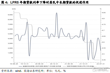 历史经验表明,下调房贷利率能有效刺激购房需求。2019年11月、2020年2月、2020年4月、2022年1月和5月,LPR5年期利率分别下降5、5、10、5和15bp,利率下降对居民中长期贷款新增具有一定的带动作用,证明了降息对促进购房需求的有效性。