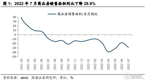 2022年以来,房地产销售大幅下滑。2022年4月受疫情等因素影响,商品房销售同比下降39%。5、6月份,随着疫情得到控制、经济逐步修复,房地产销售降幅有所收窄。但7月降幅再度扩大至28.9%,在传统销售淡季呈现出淡季更淡的特征。1-7月商品房销售面积累计同比减少23.1%。