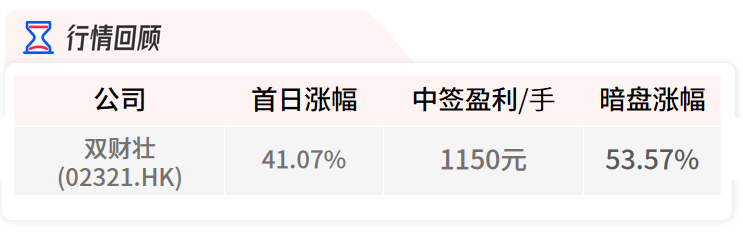 双财庄(02321)首挂收报0.79元,较招股价高41.07%,全日成交2.16亿股,成交额1.72亿元。不计手续费,每手5000股,账面赚1150元。