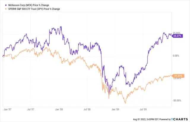 实际上,在过去20年消费者信心低迷时期,麦克森的表现通常优于大盘。