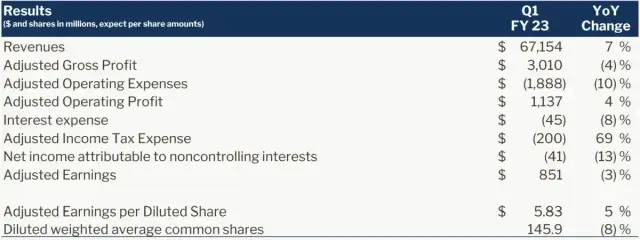 2023财年一季度(截至2022年6月30日止三个月),麦克森实现收入672亿美元,同比增长7%;调整后每股摊薄收益为5.83美元,同比增长5%。