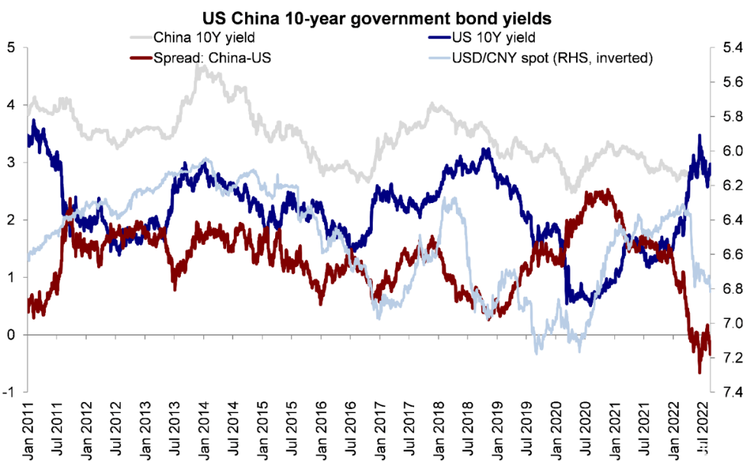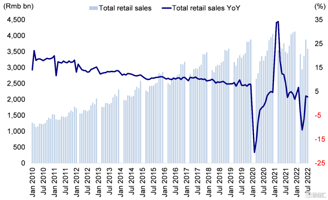 国内方面,在房地产需求二次探底以及疫情持续扰动影响下,增长前景仍然面临挑战。7月经济数据表现较为低迷,各项增长指标普遍放缓且低于预期。从主要拖累因素看,一方面,房地产销售和投资双双下滑,甚至低于4月份水平,体现了此前“断供”事件影响的发酵。与此同时,疫情反复以及防控政策也使得消费需求疲弱,社零中其中仅汽车销售等表现相对较好。具体来看,尽管存在低基数效应,7月工业增加值同比增速仍然从6月的3.9%放缓至3.8%;社零销售额同比仅增长2.7%,低于6月份的3.1%,也明显低于5.3%的市场预期。1-7月固定资产投资也同时低于市场预期,同比增速仅为5.7%(1-6月为6.1%),其中主要受地产投资拖累。7月房地产开发投资同比降幅从6月的-9.4%进一步下探至-12.3%,甚至超过了4月创出的-10.1%的低点。这一背景下,央行将公开市场操作利率和MLF利率分别下调至2.00%和2.75%[3],此举可能暗示本周的LPR利率也有望下调。央行降息显示稳增长仍然是货币政策的首要目标。但是,市场流动性已经非常充裕而经济增长仍然较为低迷,也表明仅凭货币政策也难以解决当前问题。因此往前看,未来进一步政策举措、尤其是促消费相关的财政刺激以及有关提振房地产市场信心举措对应对当前增长挑战可能更为重要。此外,近期高温天气可能带来的潜在影响也值得关注。