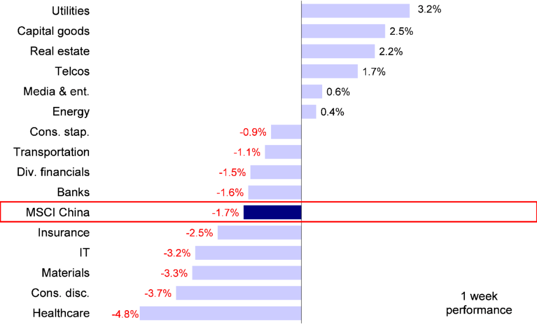 图表:受医疗保健和可选消费板块拖累,MSCI中国指数上周下跌1.7%