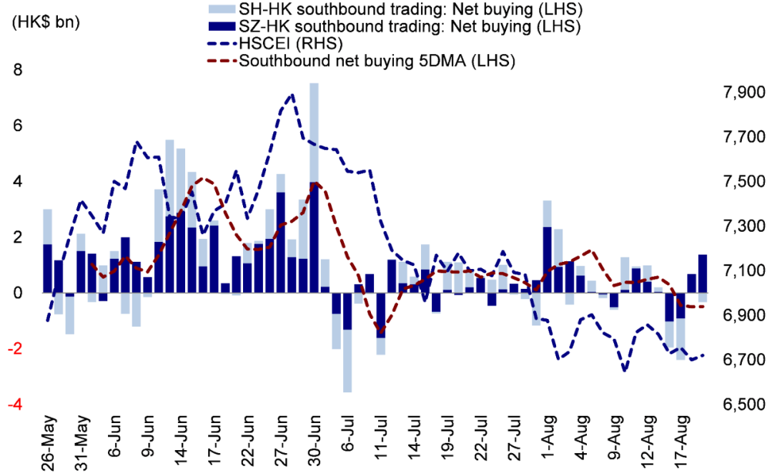 市场前景展望:受增长与政策等诸多不确定性压制,港股市场整体情绪持续低迷,与我们近期提示的情形基本一致。在五家国企集体宣布计划从纽交所退市、以及不及预期的7月金融数据公布之后,海外中资股市场上周初开局不佳。周一公布的7月经济数据也使得投资者对中国增长前景的担忧情绪再度升温。与此同时,有关腾讯计划出售持有的240亿美元美团股份的消息进一步引发恐慌[1],导致美团股价周二大幅下挫9.1%,恒生科技指数也应声大跌2.0%。市场对未经证实的消息反应异常敏感(后被腾讯方面否认)、但对一些积极的变化(如上周一央行下调MLF利率)却相对平淡,也体现了整体情绪的低迷,我们预计这一情形短期内或仍将持续。