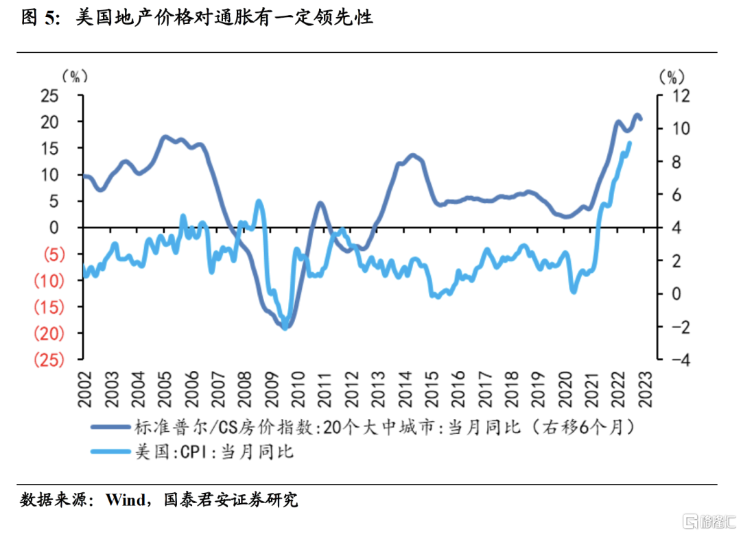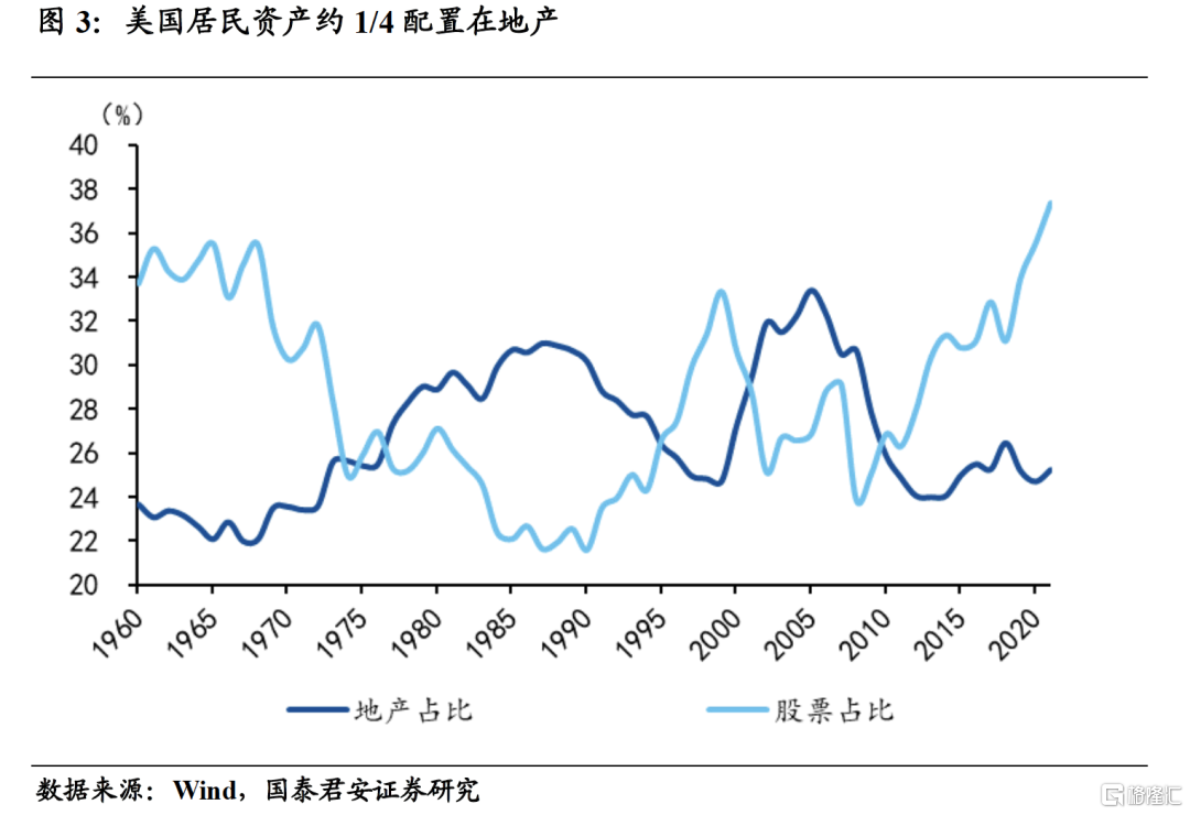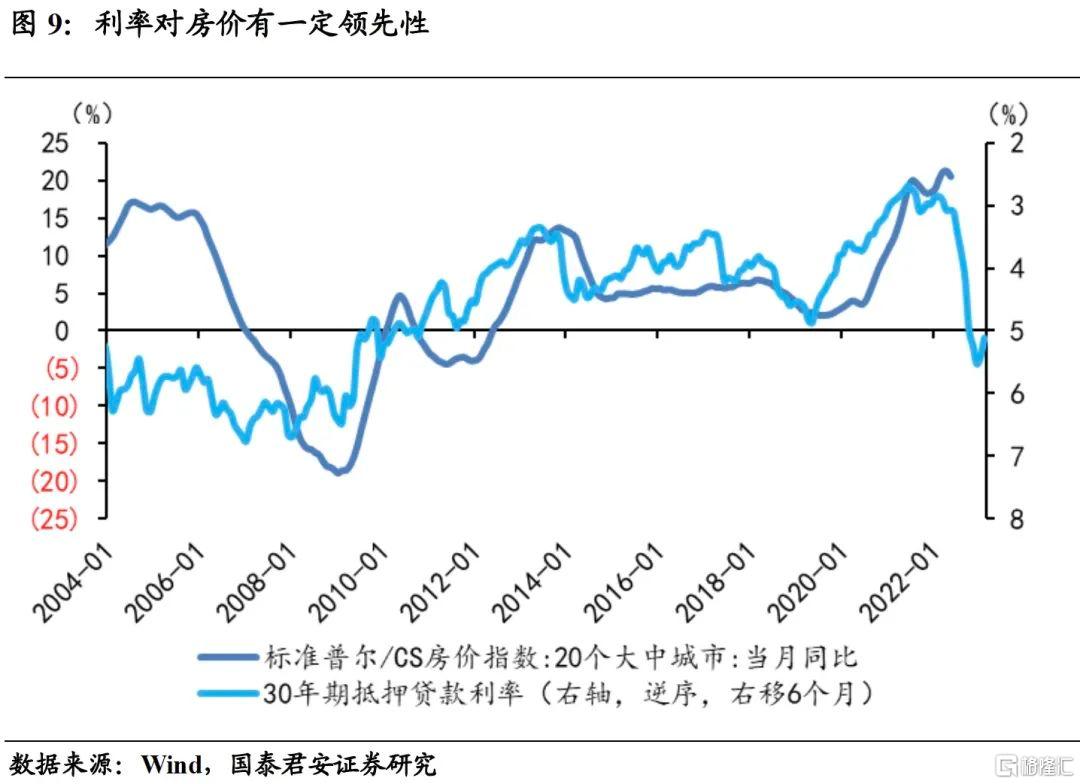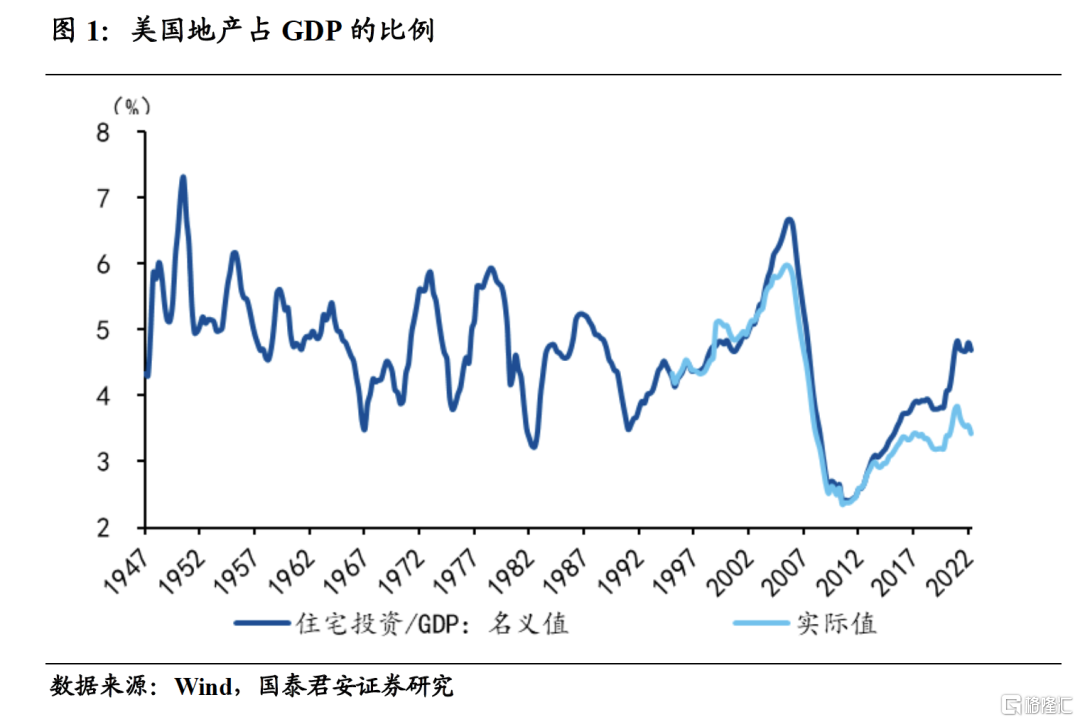 房地产在美国经济中也具有比较重要的作用。虽然美国对房地产市场的依赖度远远低于我国,但地产仍然是美国经济中的重要组成部分。从GDP角度来看,美国住宅投资占GDP比例中枢在4.5%左右,若考虑对其他行业的拉动占比会进一步提高,因此地产在经济体量上对美国来说仍然具有比较重要的作用。从居民资产配置角度来看,美国居民接近1/4资产是配置在房地产领域,地产也是美国居民资产的重要组成部分,房价的起伏也会通过财富效应影响美国居民的消费决策。