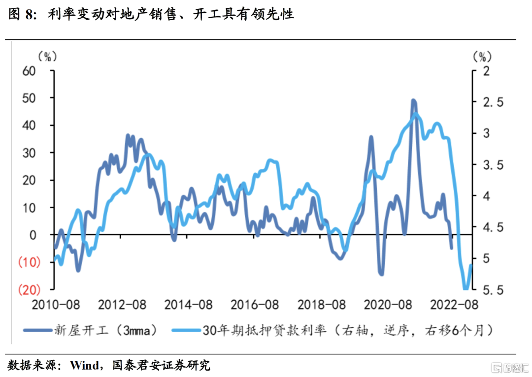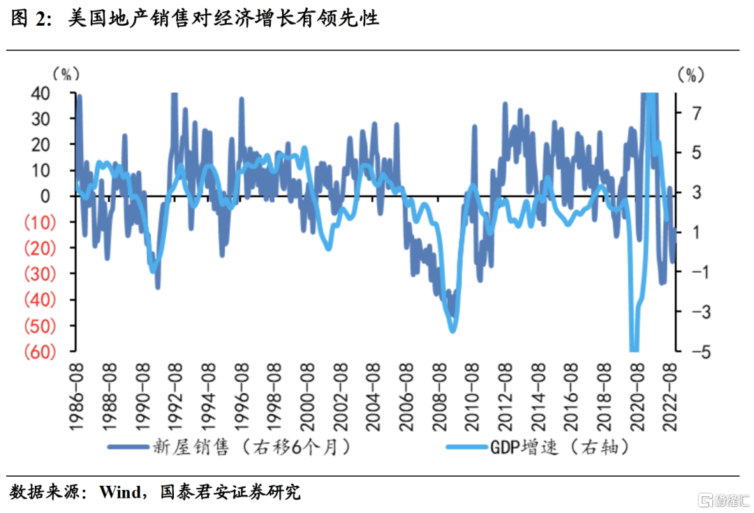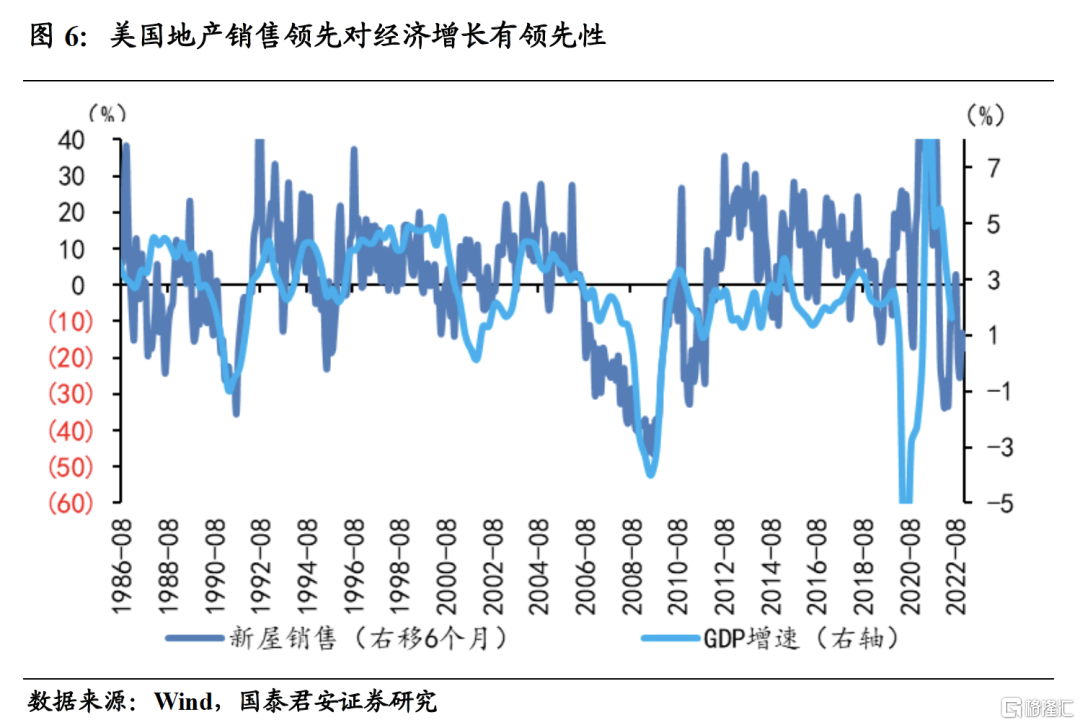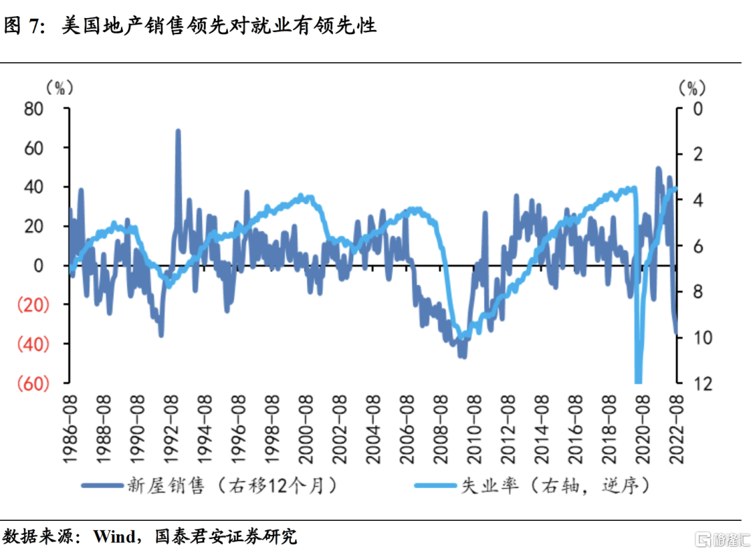 也正是由于地产的重要作用,所以地产数据一定程度上领先于美国经济。我们对地产数据和主要经济数据进行梳理,新屋销售、新屋开工、成屋销售等销售、建造数据走势基本一致,由于新屋销售会带来相应的土木建设和耐用品支出,因此我们会看到新屋销售与宏观数据相关性更强。分别从通胀、增长、就业这几个主要经济维度来看,美国地产价格对CPI具有12个月左右领先性,美国新屋销售对GDP有6个月左右领先性,对失业率有12个月左右领先性。