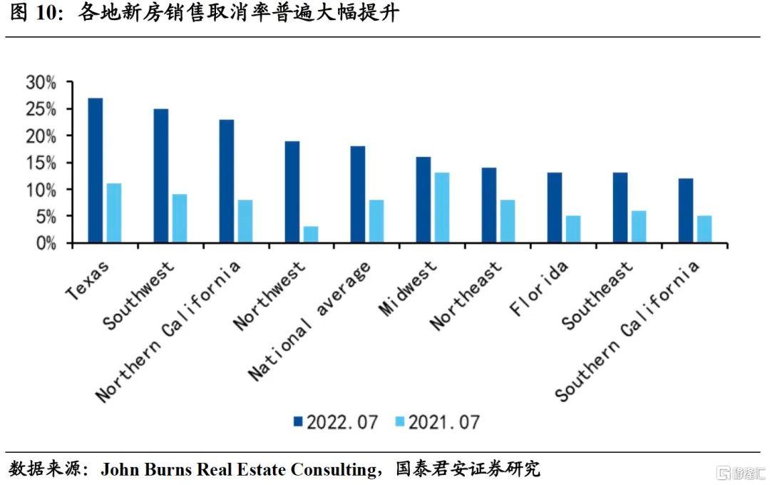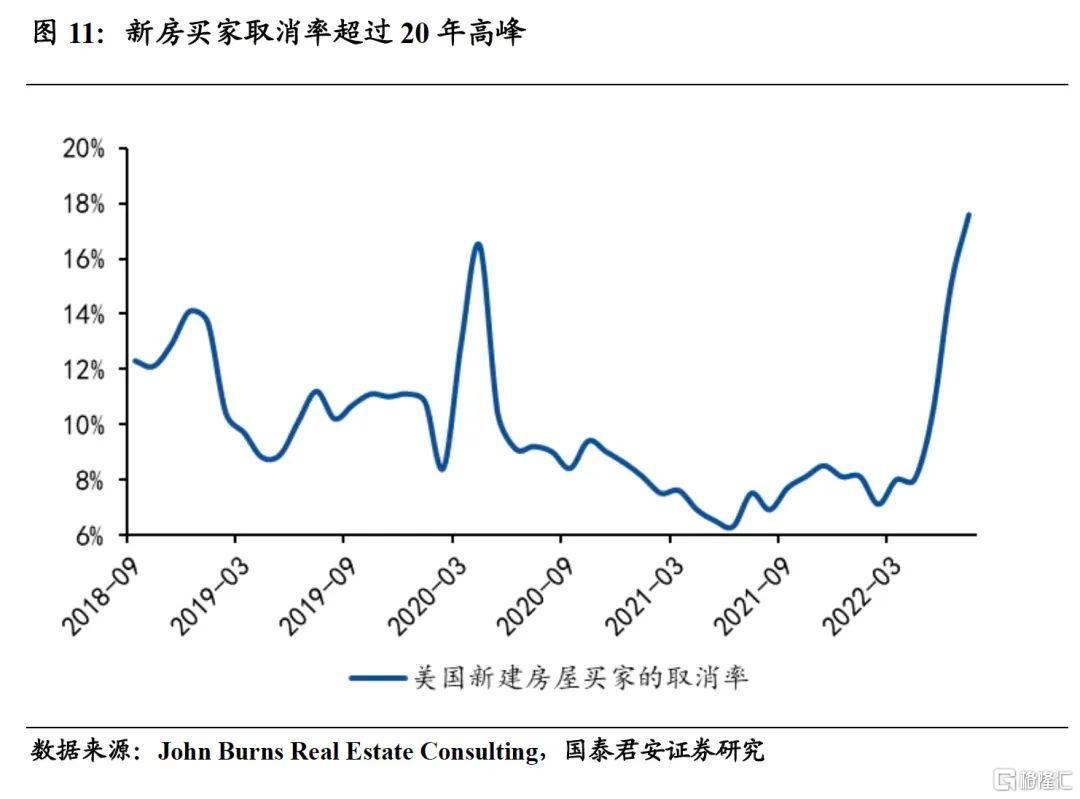 往后看,美国地产可能还未到最差的时候。利率无论对房价还是地产销售都具有领先性,从数据上来看,美国30年期抵押贷款利率领先新屋开工和销售6个月左右,领先美国房价6个月左右,而美国上半年加息进程急剧加快,这意味着未来半年可能将面临房地产数据的进一步快速走弱。微观调研数据上已经有一些迹象显示地产的进一步快速降温,比如根据美国地产咨询公司(John Burns Real Estate Consulting)统计,7月新房买家取消率进一步飙升至17.6%(美国签订新房购买合同后是可以取消的,但新屋销售并不会对取消的合约进行修正),已经超过20年的高峰(20年4月的16.5%);新屋库销比也已经处于近十年来的最高值,成屋库销比也有明显回升。