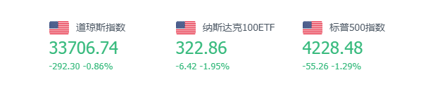 标普500指数跌55.26点,跌幅1.29%,报4228.48点。道指跌292.30点,跌幅0.86%,报33706.74点。纳指跌260.12点,跌幅2.01%,报12705.22点。对美联储激进加息的担忧重新浮现,上周美股三大股指均录得跌幅。市场继续评估央行加息路径与美国经济衰退的可能性。