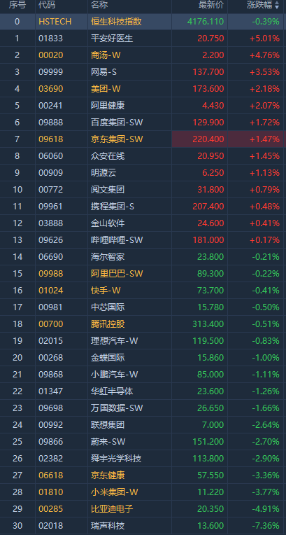 平安好医生涨5.01%领涨成分股,商汤涨4.76%,上周获纳入恒生国企指数;网易涨3.53%,美团涨超2%,京东涨1.47%,哔哩哔哩微涨。