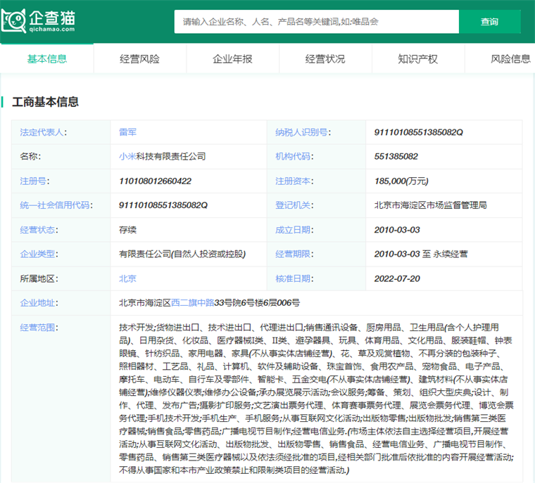 小米科技有限责任公司成立于2010年3月3日,法定代表人为雷军,其经营范围包括技术开发;货物进出口、技术进出口、代理进出口;销售通讯设备、厨房用品、卫生用品(含个人护理用品)、日用杂货、化妆品、医疗器械Ⅰ类、Ⅱ类、避孕器具、玩具、体育用品、文化用品、服装鞋帽、钟表眼镜、针纺织品、家用电器、家具(不从事实体店铺经营)等。