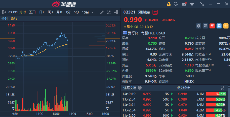 华盛资讯8月22日消息,午后港股次新股双财庄短线剧烈拉升,当前涨幅25.32%,成交量9896万,当前市值9.54亿港元。