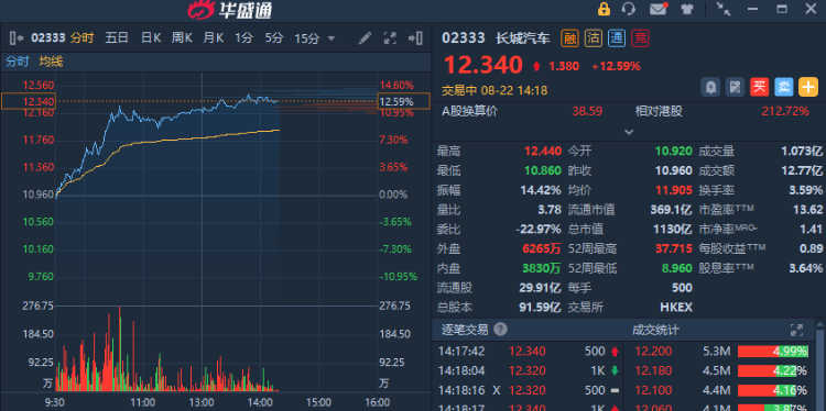 华盛资讯8月22日消息,午后港股长城汽车涨超12%成交量1.073亿,当前市值1130亿港元。政策指出将已两次延期实施、今年底到期的免征新能源汽车购置税政策,再延期实施至明年底。