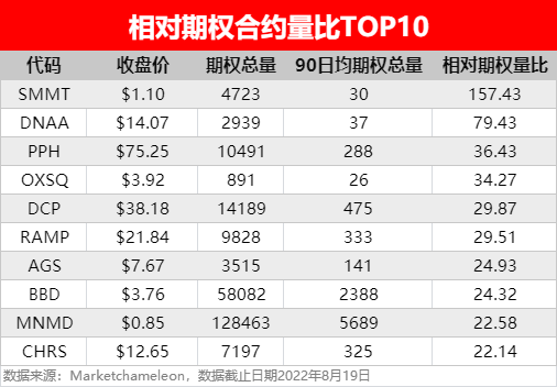 注:相对成交量比,是指当前交易日期权成交数量与90日平均期权成交数量的比值,相对成交量比越高,意味着该期权标的近期活跃度越高,不同于期权成交总量,该量比指标可以帮助发现一些期权成交数量绝对值不高,但是近期成交数量显著上升的期权标的。