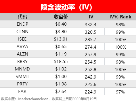 重点动态:制药公司远藤制药 $ENDP 、WSB概念股MNMD和 $MNMD 此轮散户抱团股龙头3B家居 $BBBY 等个股的隐含波动率持续高位,其中ENDP的隐波率为连续第二天位居首位。