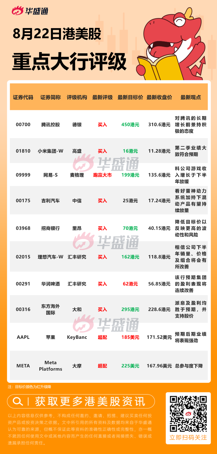德银发表报告指,腾讯 $00700.HK 第二季收入比市场预期略低出1%,原因是游戏和金融科技业务表现疲软,部分被更强的广告收入所抵销。由于有效的成本优化措施,经调整纯利仍比市场预期高出15%。目标价由470港元降至450港元,维持“买入”评级,对腾讯的长期增长前景持积极的态度。
