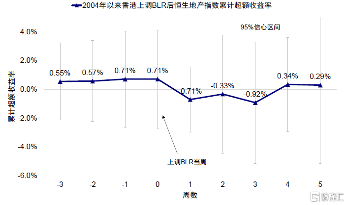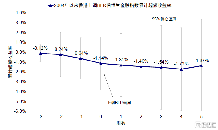 我们通过回溯方式测算上调BLR前后港股市场和板块的超额收益变化,来捕捉这一事件的影响程度。具体测算中,我们基于CAPM模型,测算2004年以来9次BLR上调前后港股(恒生综指)相对MSCI全球的超额收益变化。