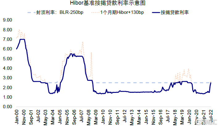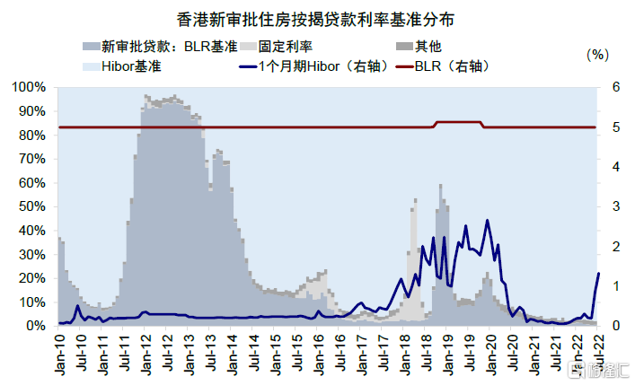 尽管如此,BLR仍是以Hibor为基准的住房按揭贷款的封顶利率。金融危机以来长期低利率环境使得购房者更愿意选择以更低的Hibor作为按揭贷款基准利率(当前以BLR为基准的占2022年6月新审批按揭贷款比例不到2%),但由于按揭贷款通常仍会将BLR设定为封顶上限,因此BLR的变化仍会影响按揭贷款利率上限(图表10)。