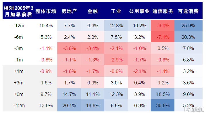 图表35:2005年在加息周期开启之后,领涨板块从可选消费、工业、以及公用事业开始向金融、地产和通信服务板块切换