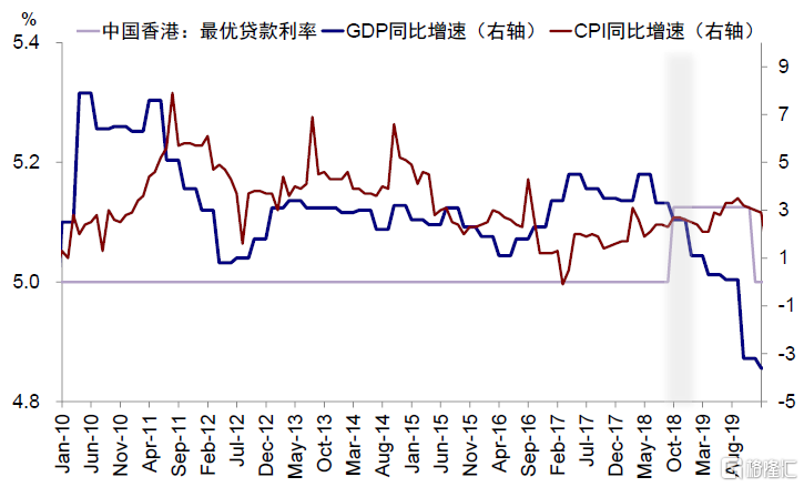 2018年加息周期,香港上半年经济维持强劲增长,但下半年明显放缓。2019年中美贸易摩擦升温和本地社会事件使香港经济步入衰退,GDP在19年三季度出现负增长。整体通胀压力维持大致温和,CPI同比2.8%左右(主要由于猪肉价格上涨所致)。