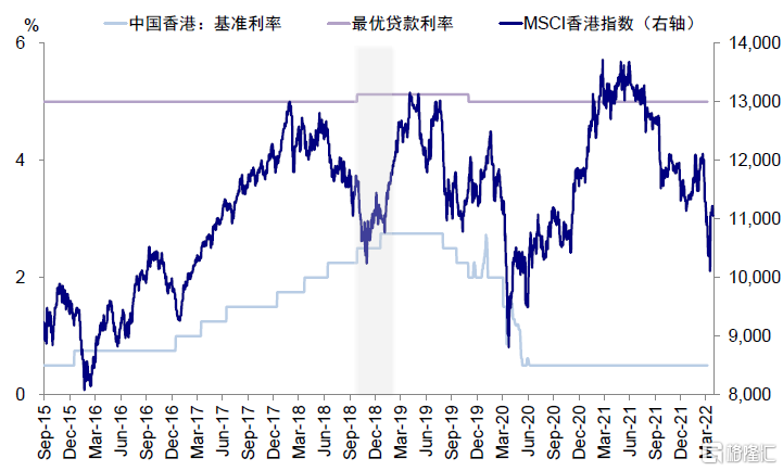 3) 汇率:港币汇率得到一定支撑。根据2005和2018年加息周期的经验,最优贷款利率上调会使得香港和美国的利差再度走阔,因此港币对美元汇率在整个加息周期也得到一定支撑。