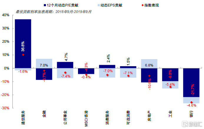 图表38:2018年加息中其中,盈利对通信服务和公用事业的贡献较大;而估值对金融和房地产有一定支撑