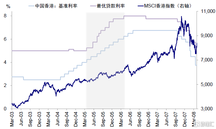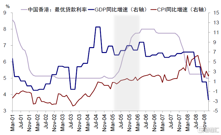 ►从大的宏观背景来看,2005年最优贷款利率加息周期适逢香港经济的高速增长(在2005年3月到2006年3月持续一年的加息周期中,香港GDP同比增速从6.4%上升至9%)和通胀温和上行的大环境(2005年3月加息时,CPI同比为0.8%,但在整个加息周期中持续抬升,平均水平为1.24%)。