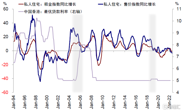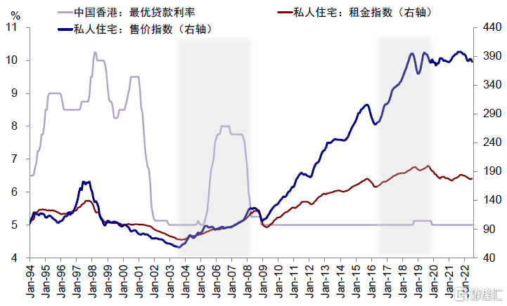 第三,从与最优贷款利率更为相关的香港房地产市场来看:房价通常处于上行通道