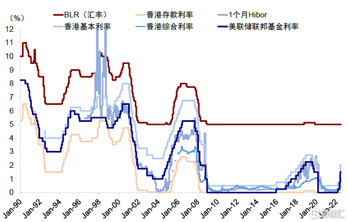 3)最优贷款利率(Best lending rate或Prime rate):香港银行自主调整的贷款利率,汇丰银行每月底公布的报价往往是市场主要参考指标(当前为5%)。虽然名为贷款利率,但金融危机后持续宽松的流动性使得利率更低的Hibor为基准的贷款成为主导(占2022年6月新发行按揭贷款的98%,而以最优贷款利率为基准的按揭占比不到2%),不过由于最优贷款利率仍是以Hibor为基准的按揭贷款的封顶利率,因此影响仍不可忽视。相比之下,最优贷款利率和银行的存款利率联系更加紧密,因此其上调也会影响银行的融资成本。